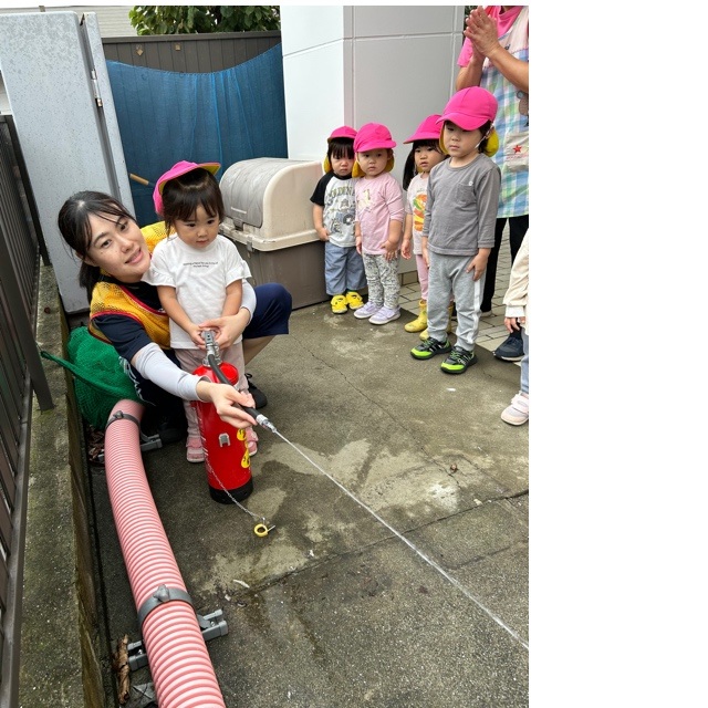 各クラスごとに外へ出て、先生たちの水消火器を使った消火訓練の様子を見ました。