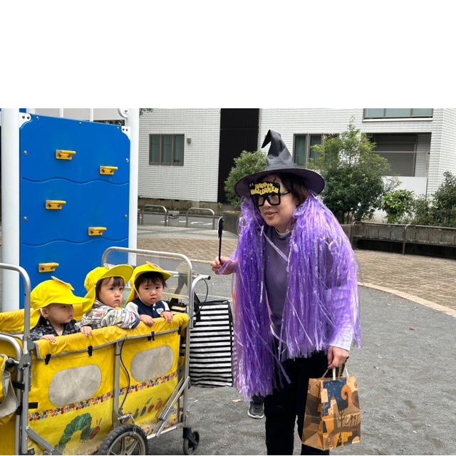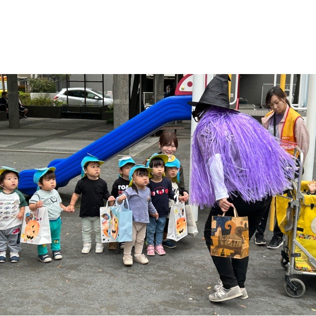 2025年11月14日 Happy Halloween②🎃👻 ジャーン!!!!!🧙 えっ!? この紫色の人は誰???? 👀👀👀👀 ‘だれだろー?‘ ‘まじょ???‘ 公園に遊びに来たら 子どもたちの前に突然現れた魔女さんは 子どもたちと仲良くなりたかったようです。 楽しいゲームをして魔女さんからも プレゼントをもらいすっかり仲良しになりましたよ🎁 今年のハロウィンも素敵なことがいっぱい✨ 楽しい思い出がまたひとつ増えました👻🎃👻