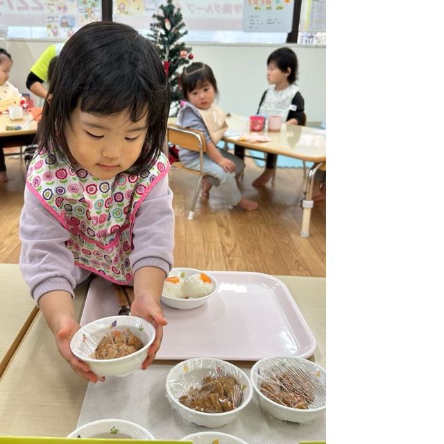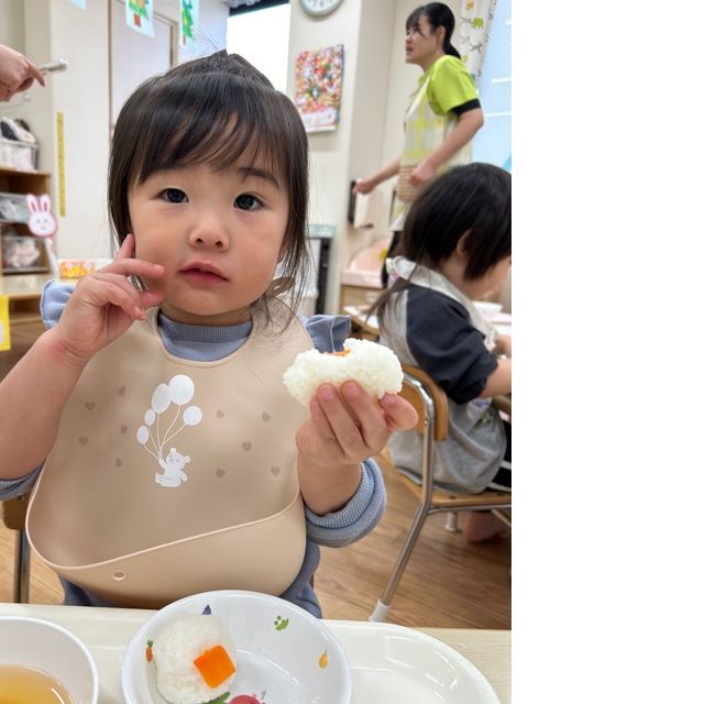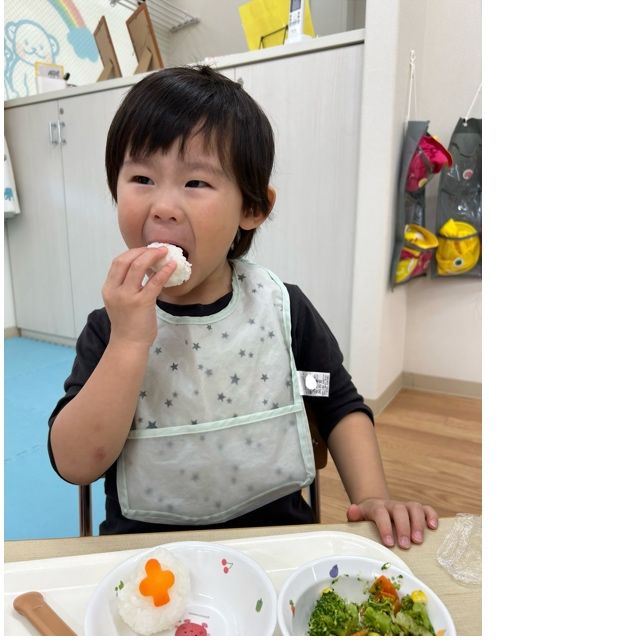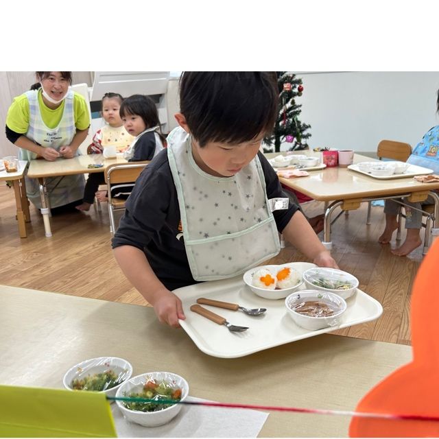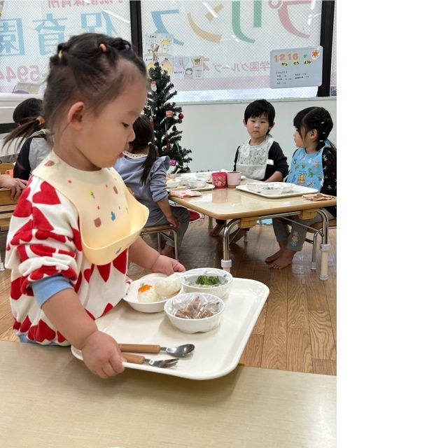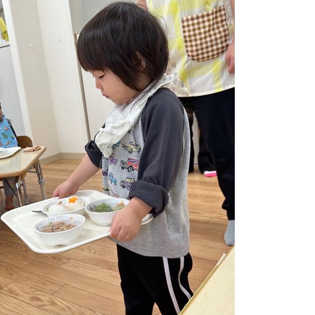 先生や給食さんが見守る中、みんな上手に自分で食事トレーを運び着席です🍙