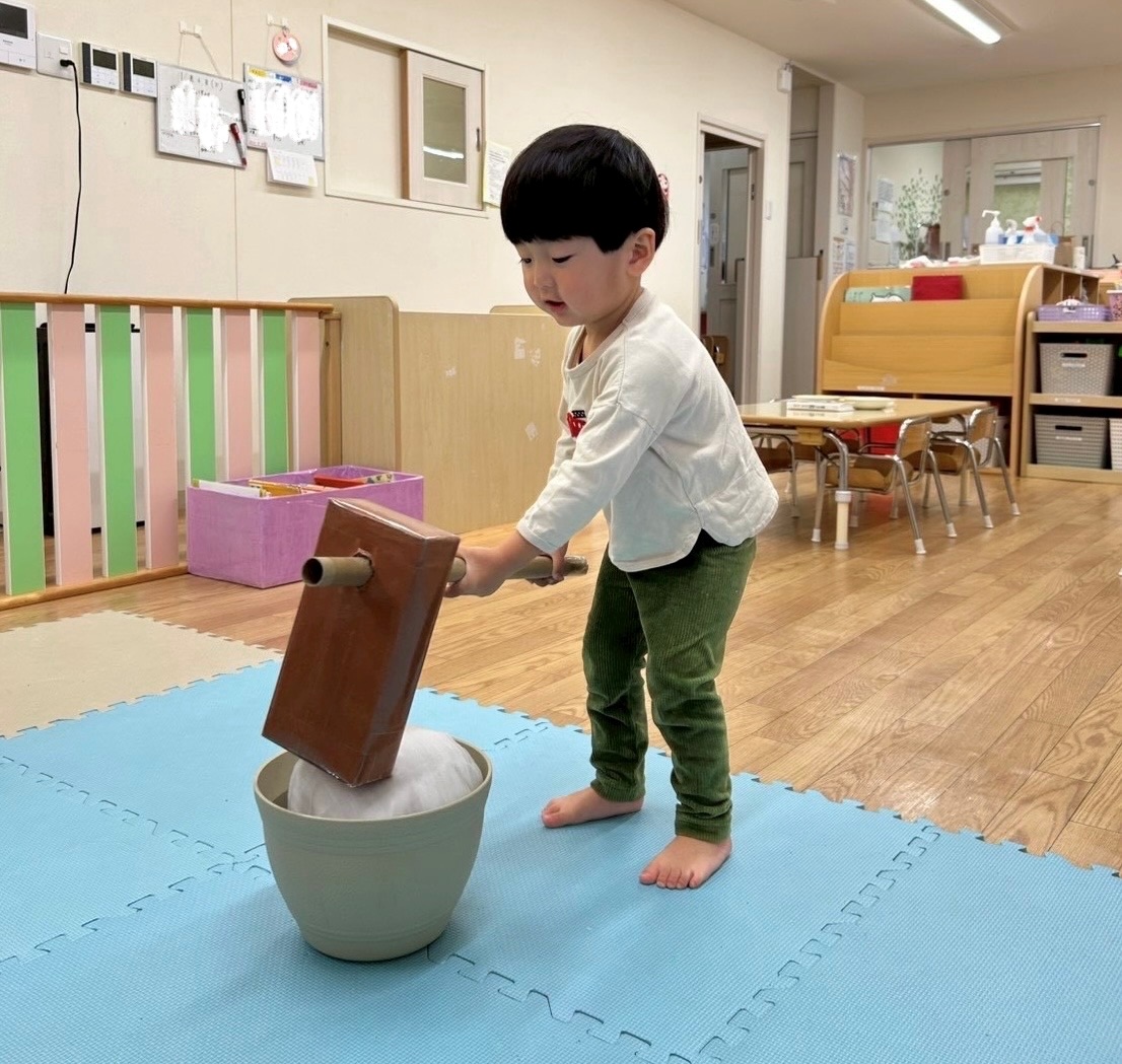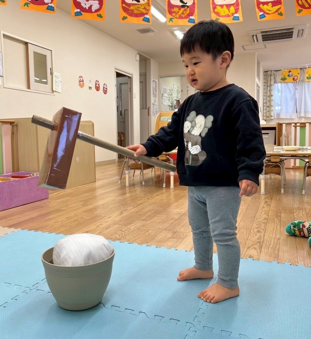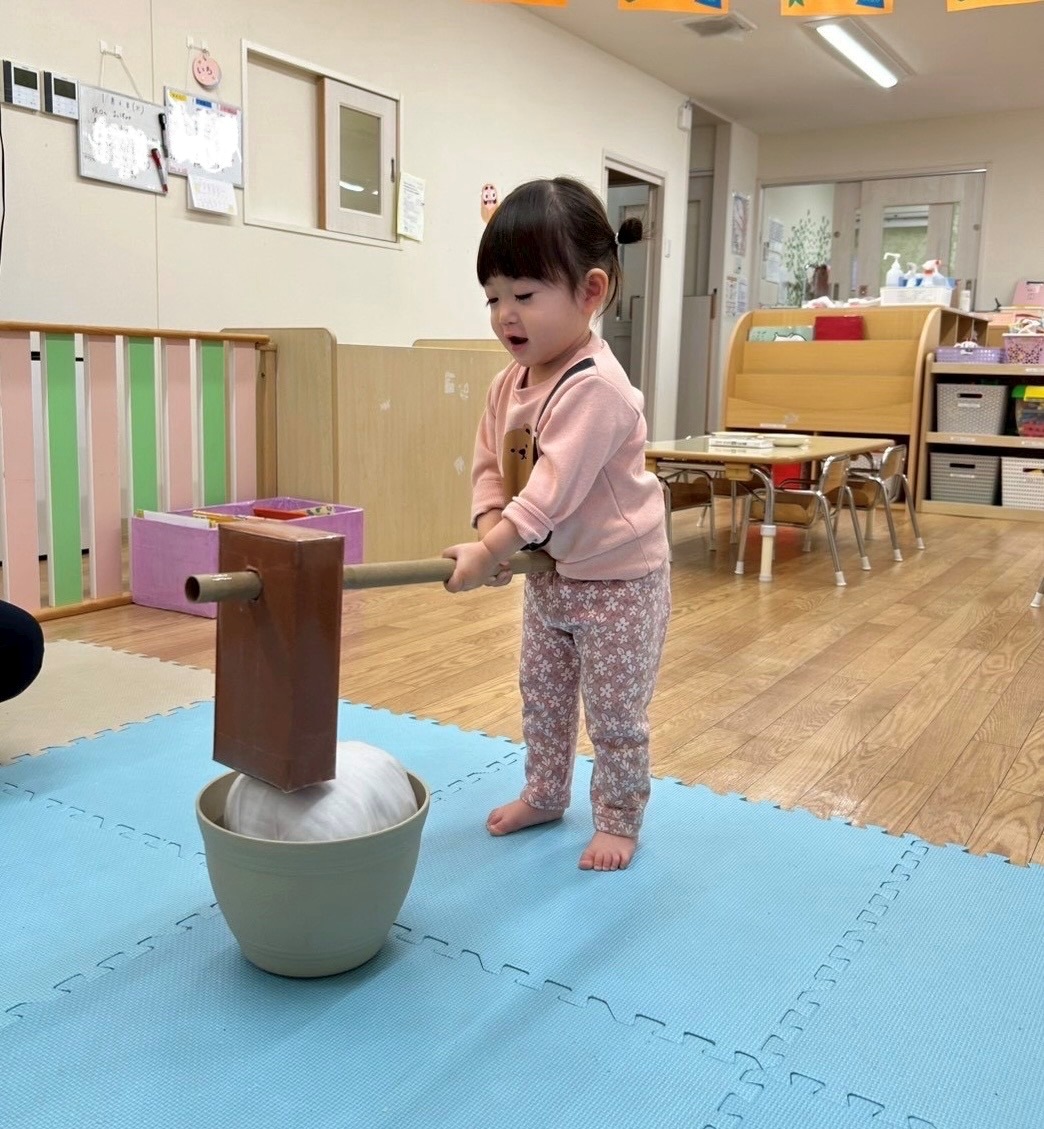 保育園では今年もお餅つきごっこを先生方が計画してくれましたよ‼️